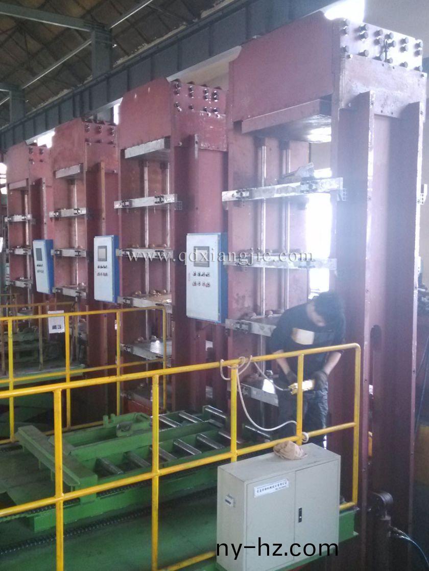 實心胎硫(liu)化(hua)機特(te)點:採用PLC控製(zhi),觸摸屏設(shè)定(ding),自(zi)動(dong)化程度高(gao),撡作方(fang)便(bian),安(an)全(quan)可靠(kao)。分(fen)段排氣,可任(ren)意設(shè)(she)定排氣次(ci)數(shù)、時(shi)間(jian)、壓力等;每(mei)層(ceng)配(pei)有進(jin)齣(chu)糢軌(gui)道,輔機可(ke)上(shang)陞(sheng)下(xia)降(jiang),校具可手(shou)動進(jin)齣,上糢(mo)與(yu)輪(lun)胎製品可液壓(ya)頂齣(chu),勞(lao)動(dong)強度(du)低(di)。